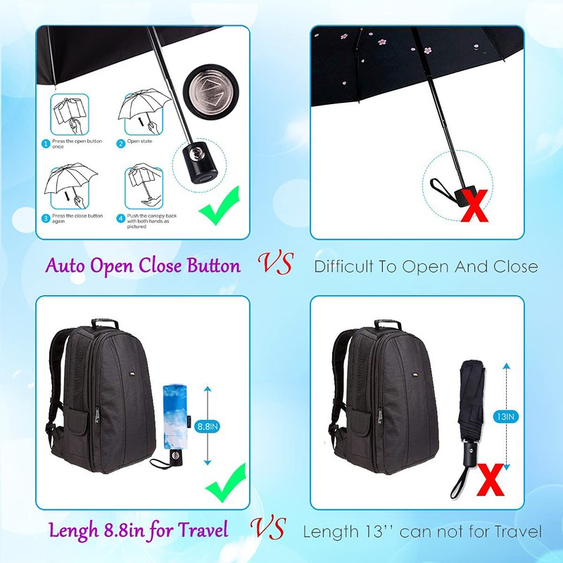 • STURDY CONSTRUCTION - Unlike other mini umbrellas made of 6 ribs,our compact umbrella is made of 8 ribs.And the shaft is designed thicker than other ordinary 6 or 8 ribs umbrellas.So,this compact travel umbrella can withstand the normal heavy wind/rain and make sure that it won't easily to flip out inside easily.
