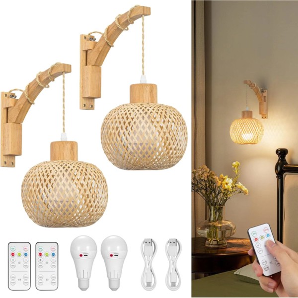 6.【Package Included & Warranty】indoor cordless boho bamboo battery powered wall sconce set comes with 2 wall lamps, 2 rechargeable LED bulbs, 2 remote controls, 2 USB charging cable (Type-C), mounting screws. All Glitnous wall sconces come with a 12-month warranty. If you have any questions before or after purchase, please feel free to contact us.