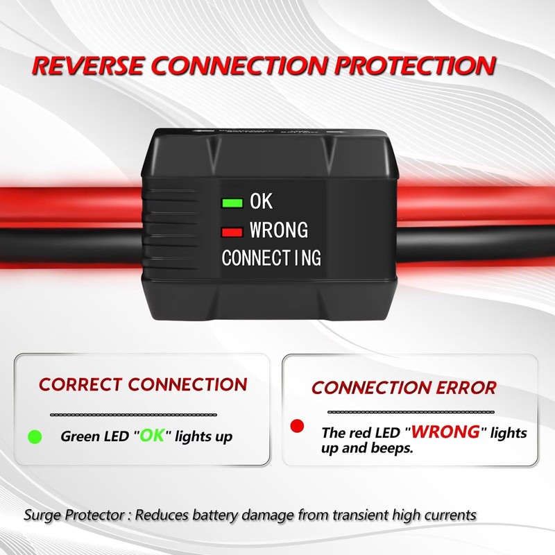 - REVERSE POLARITY PROTECTION :Smart-6 Reverse Polarity Protection is used to prevent short circuits and incorrect connections. When connected correctly, the green LED lights up. If connected incorrectly, the red LED light will turn on and an alarm will sound