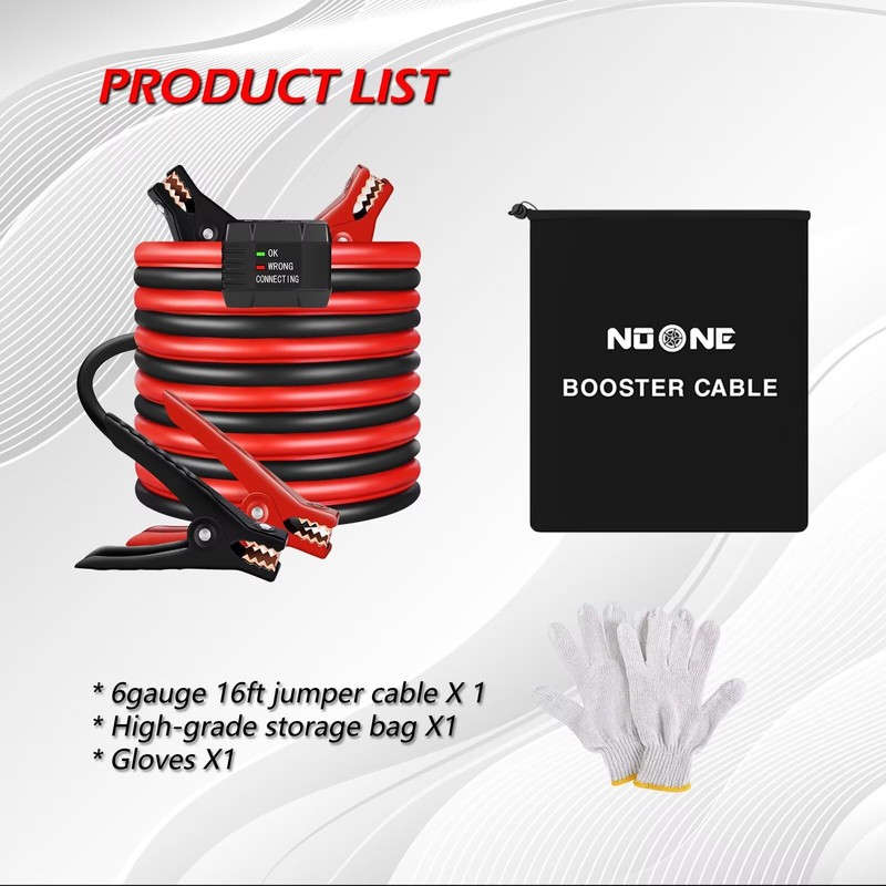 - THE BRAND NAME YOU CAN TRUST:In addition to 6 Gauge 16 FT Jumper Cables×1, you will also get: Carrying Bag×1, Gloves×1. NOONE jumper cables kit for car provides 3 years products service. Please feel free to contact us if you have any questions