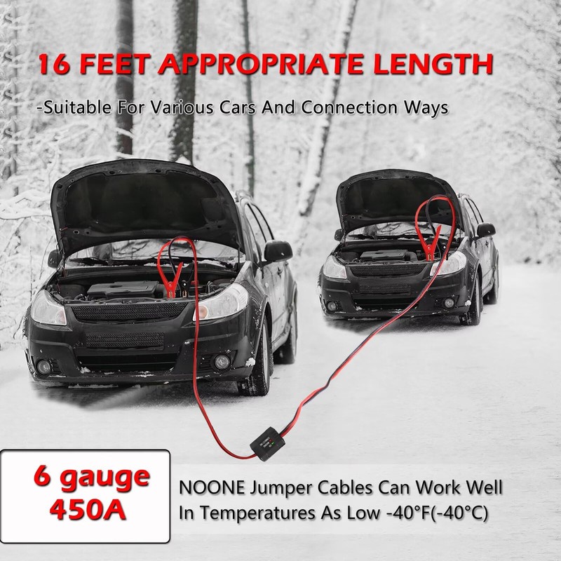 - NOONE 16 FEET JUMPER CABLES : 6 Gauge, 16 feet booster battery jumper cables for jump starting dead or weak batteries. Ideal for trucks, SUVs, full-size cars, mid-size cars, and small/compact cars