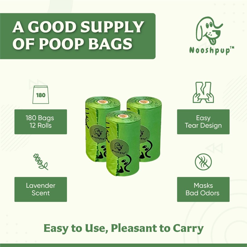 Nooshpup – Lavender Scented Dog Poop Bags – Durable, Leak-Proof, and Easy Tear Design – 100% Recycled Packaging – Made with Cornstarch – ASTM D6400 & NF T 51-800 Certified