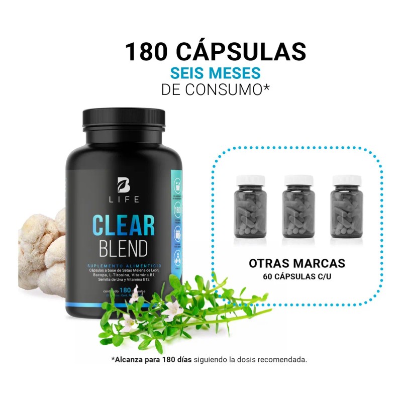 Potencia tu mente con Clear Blend B Life! Cada cápsula contiene 500 mg de nuestra exclusiva combinación de Setas de Melena de León, Bacopa, L-Tirosina, Semilla de Uva Roja y Vitaminas B1 y B12. Una poderosa formulación nootrópica que ninguna otra presentación ofrece. Contiene 180 cápsulas.
