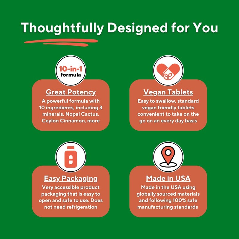 - SUSTAINABLE & SYNERGY FORMULA: Our formula features a 10-in-1 potent blend of Nopal Cactus, Ceylon Cinnamon, Berberine HCl, Gymenma Sylvestre, Bitter Melon, Banaba 1% Corosolic Acid, White Mulberry Leaf, Chromium Picolinate, Selenium, and Zinc. Each ingredient works synergistically with others to support a balanced metabolism and the body's overall wellness, all while prioritizing sustainability and quality in order to provide all of our customers with products of the highest purity and safety.