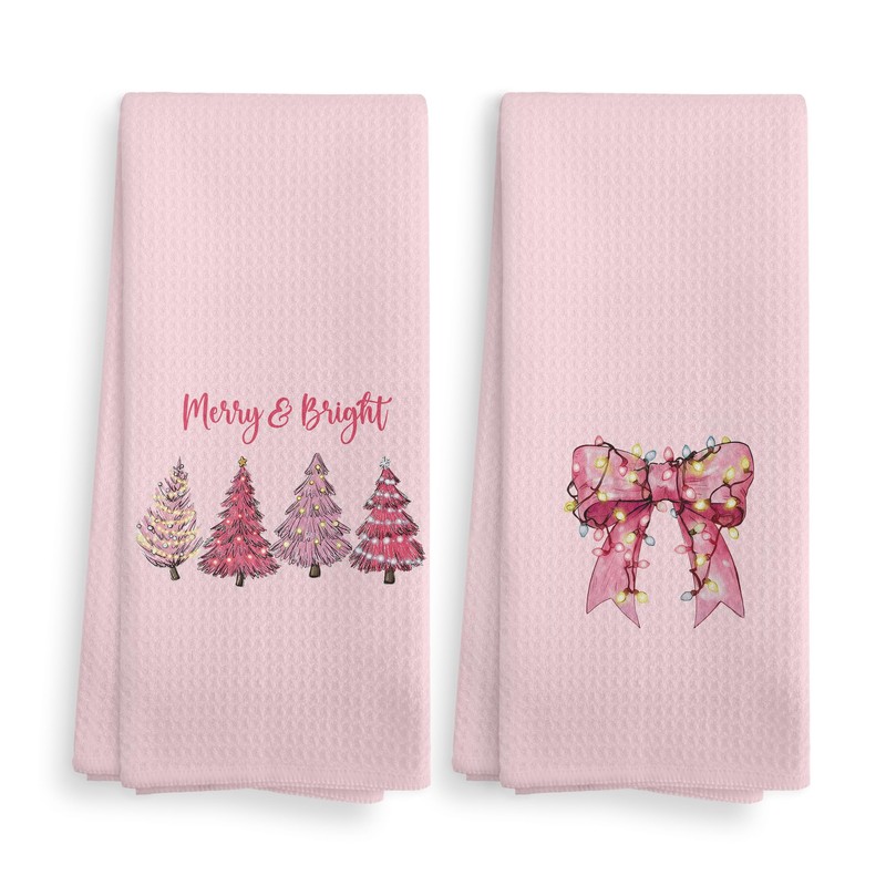 NOQL Girly Pink Christmas Tree Bow Decorative Kitchen Towels and Dishcloths Set of 2, Preppy Hand Towels, Merry and Bright Drying Cloth Hand Towels Tea Towels for Bathroom, 16×24 Inch
