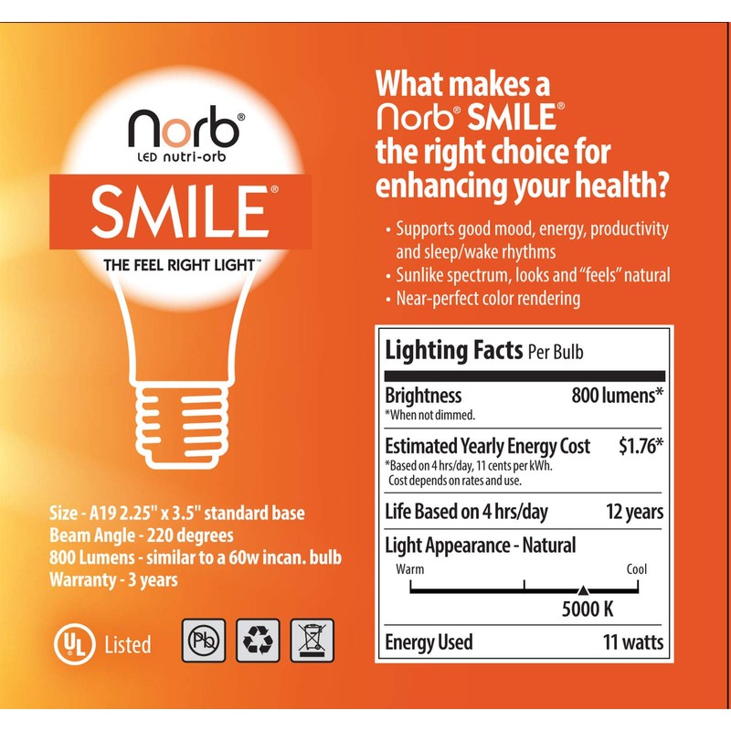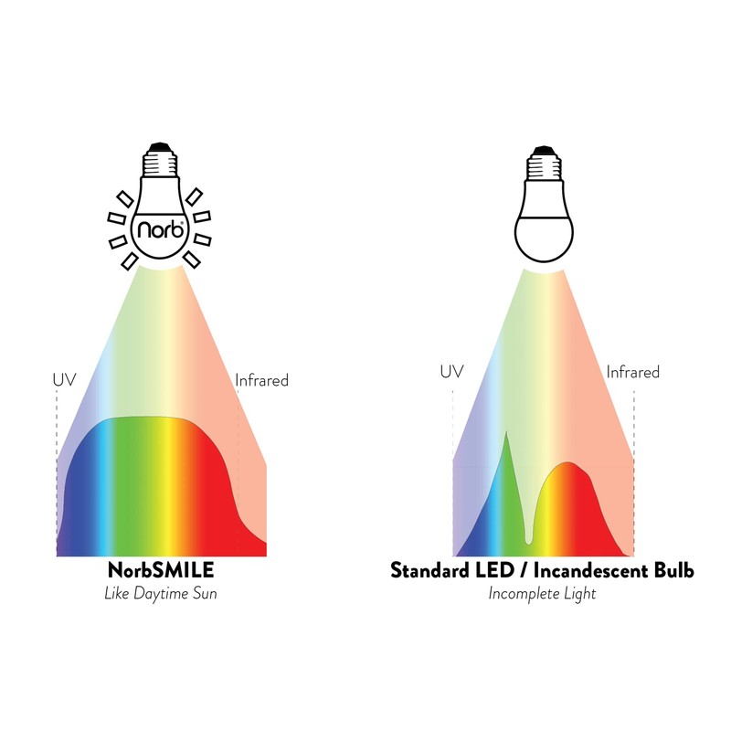 NorbSMILE is a Nutri-Orb, a unique white light with a specialized sunlike spectrum to lift your spirits and boost your energy year-round.