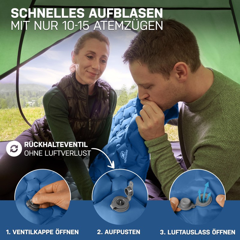 - Easy to inflate: with just 10-15 breaths, the camping sleeping mat can be inflated with your mouth in no time at all. The innovative restraint valve prevents unwanted outflow of air