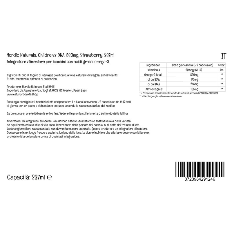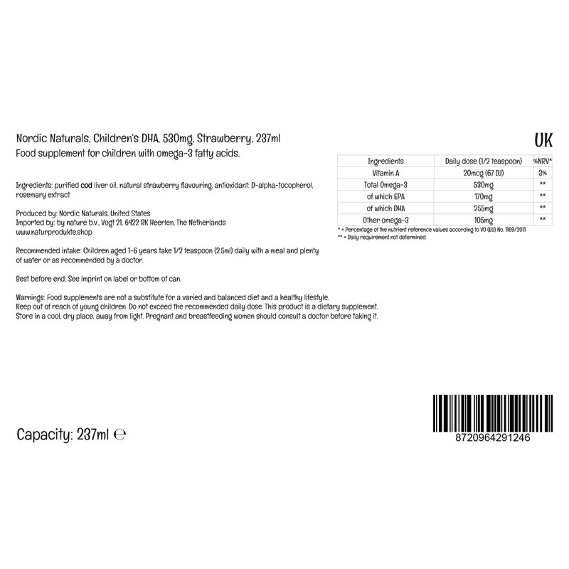 Nordic Naturals, Children's DHA, 530mg Omega-3 from Cod Liver Oil, Strawberry Flavour, with EPA and DHA, 237ml, Lab-Tested, Soy Free, Gluten Free, Non-GMO