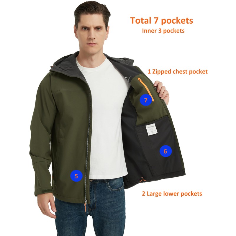 NORDIC OUTLAND Men's Waterproof Softshell Rain Jacket, Hooded Windbreaker with 7 Pockets, Lightweight Shell for Hiking and Outdoor Activities (US, Alpha, XX-Large, Regular, Regular, Army Green)