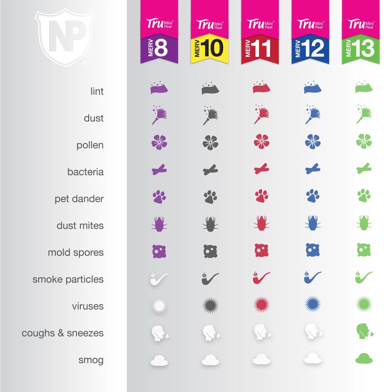 The Tru Mini Pleat filter effectively removes lint, household dust, pollen, pet dander, dust mites, mold spores, smoke particles, virus carriers, and allergens. For consistently fresh and clean air, especially during renovations or home improvements, we recommend replacing your HVAC filter every 2-3 months, depending on your environment.