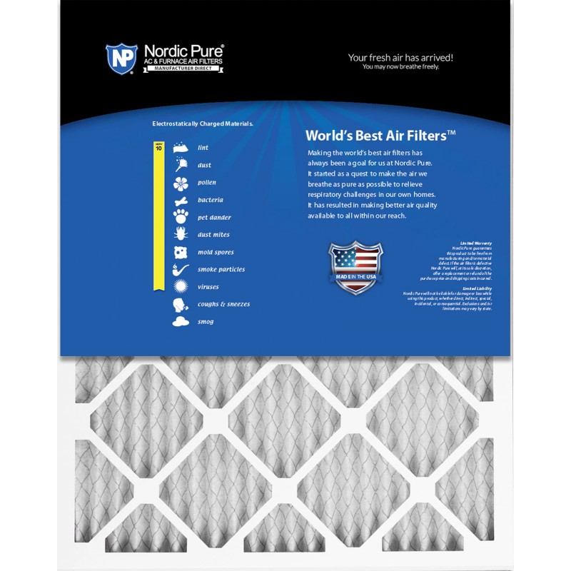 Nordic Pure MERV 10 Pleated AC Furnace Air Filters provide exceptional filtration for both home and commercial environments. Each time air passes through a Nordic Pure pleated furnace air filter, lint, dust, pollen, bacteria, pet dander, dust mites, mold spores, smoke particles, virus carriers, allergens and other contaminants are removed.