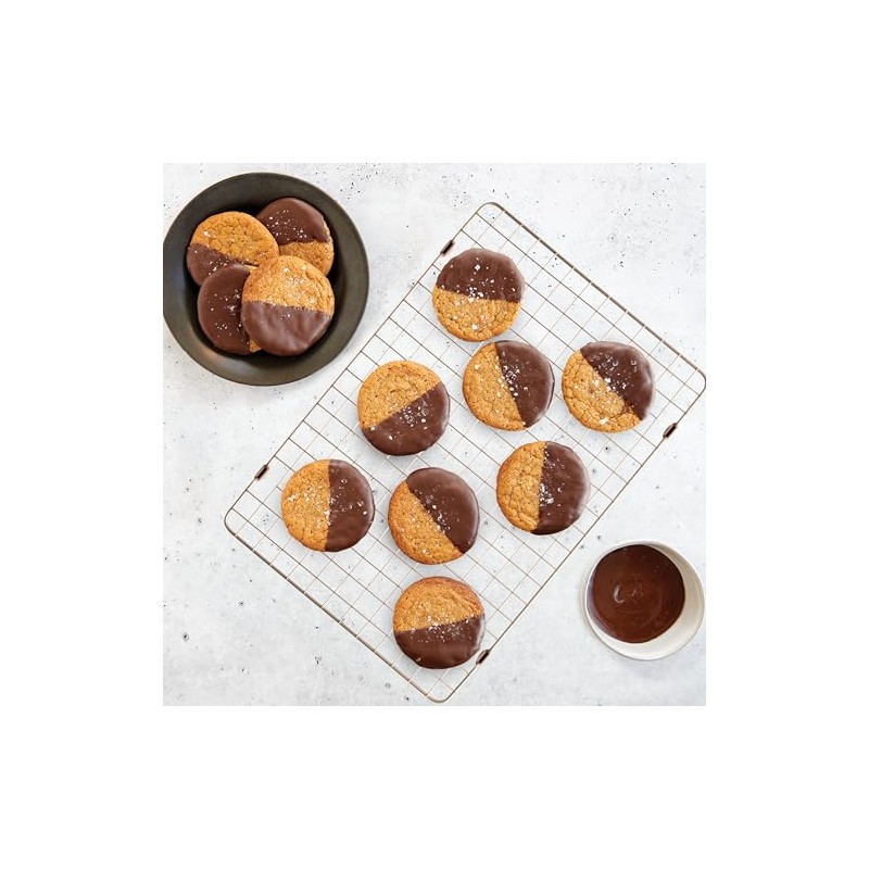 - Rack nests in half sheet pan to catch drippings while glazing cakes, cookies or cooling deep fried foods like chicken, wontons or donuts.