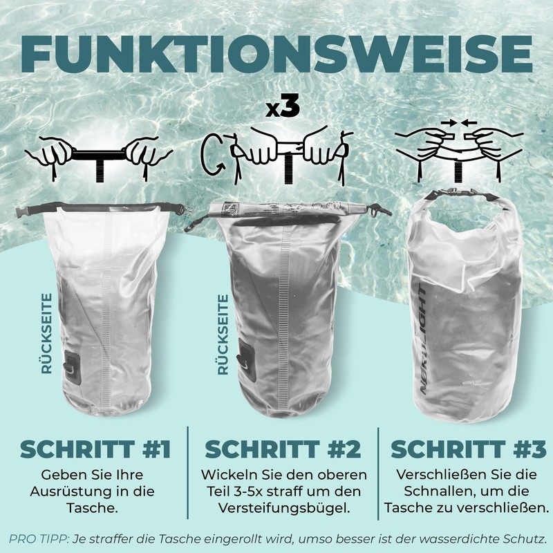 - One item for all occasions: We use a robust, scratch-resistant and seamless PVC tarpaulin that can withstand (almost) anything and is still super light. Our waterproof bags have a roll-top closure and are the perfect companion for all outdoor adventures. Everything stays dry.