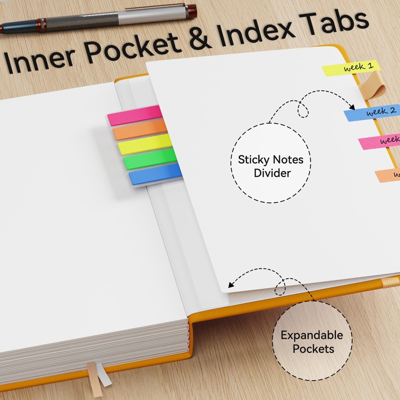 - 【Perfect Design】:A5 hardback notebook has 4 directory pages, which can record more entries; 2 ribbon bookmarks for quick access to important content; The expandable inner pocket on the back can store notes, business cards, receipts, appointment cards, etc; use elastic bands to close the cover, and the pen holder ring can fix the pen.