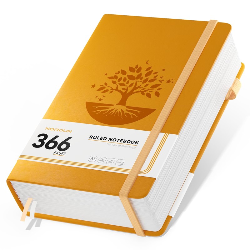 NORDUN Notebook A5 Lined Journal,Hardcover Leather Journal with 366 Pages 100gsm Thick Paper, Index Tabs,College Ruled Notebook for Women Men Writing Work School Office,14.5 x 21cm - Yellow