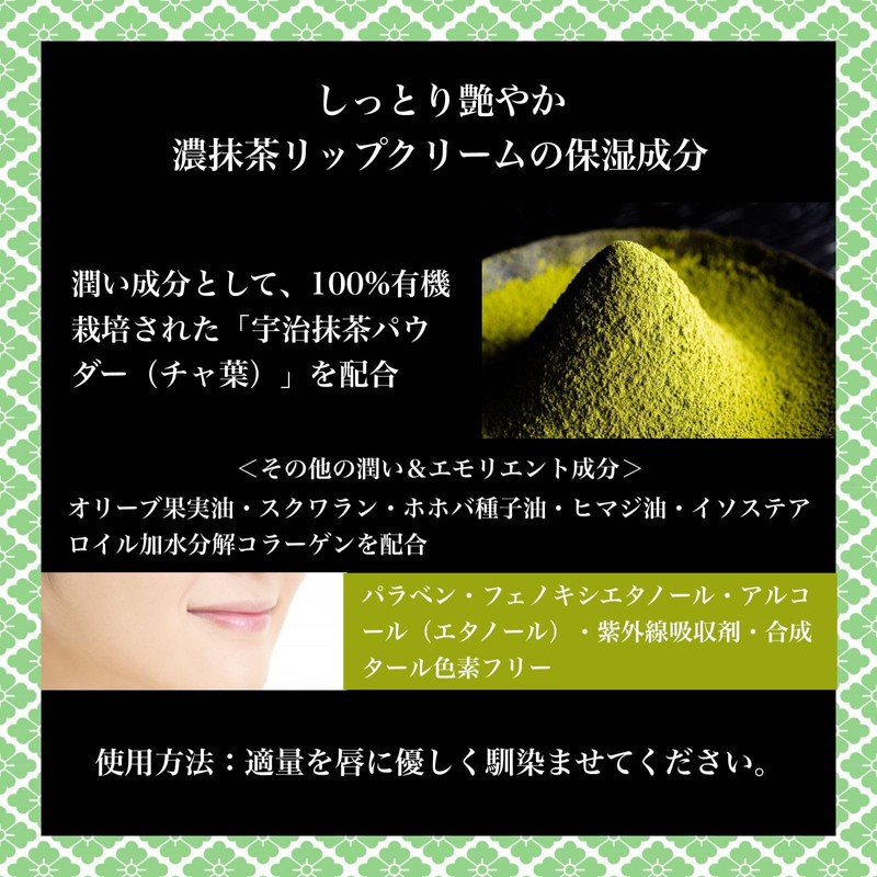 - This is an ingredient that helps to condition and moisturize your skin while preventing skin rashes. It is also free of parabens, phenoxyethanol, alcohol ethanol, UV absorbers and synthetic tar pigments, so it can be safely used by people with sensitive skin. Dark Matcha Lip Balm gently protects your lips from dry and leads to shiny, moisturizing lips