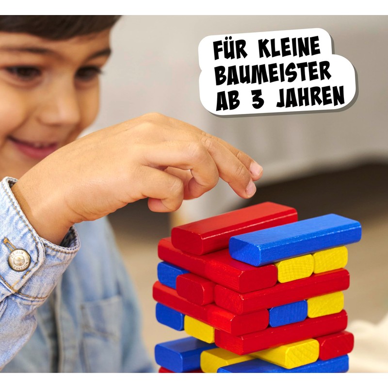Noris 606012165 - 3 Colourful Building Block Games (Building Blocks from 3 Years) - 54 Wooden Building Blocks with 3 Game Ideas (Wobble Tower, Building Houses & Domino Snake), Toy for Children
