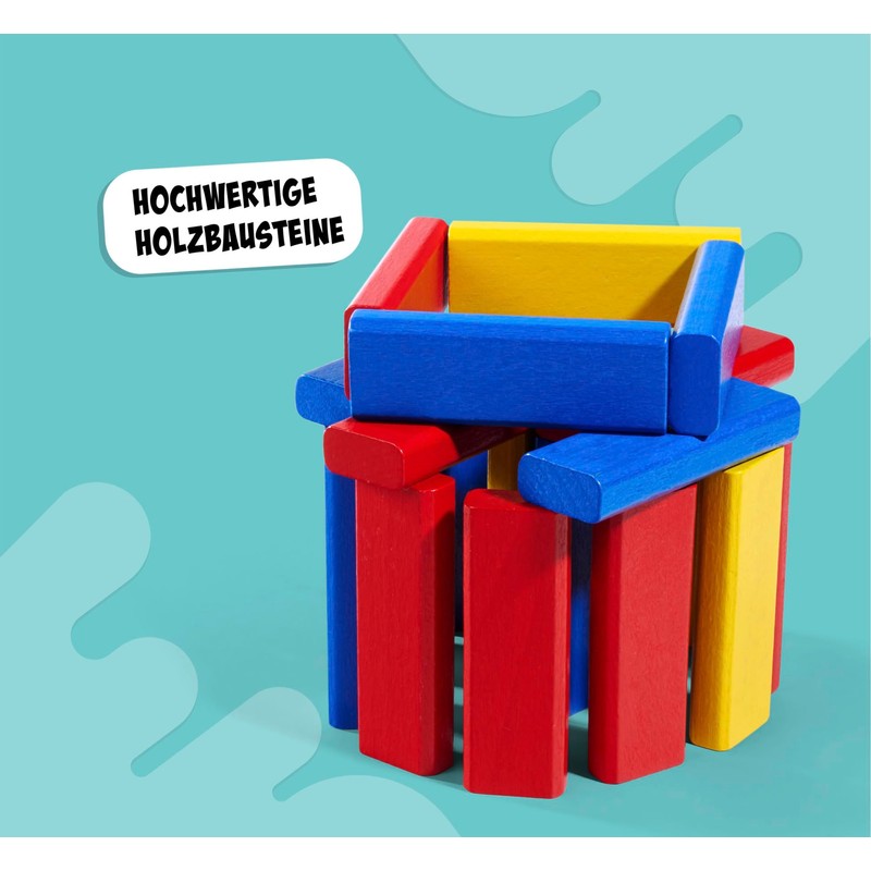- Made in Germany – The high-quality wooden building blocks in three different colours have been produced to the highest quality standards: stable, safe and absolutely free of splinters and harmful substances.