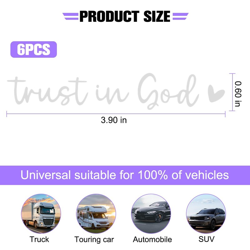 - Showcase your Personality: Once installed, the car sticker adheres firmly and does not easily peel off, remaining securely attached to the vehicle's surface for an extended period. The "Trust in God" text is presented in a clear and elegant font, highly visually appealing. Whether applied to the side of the vehicle, the rear, or the windows, it instantly catches the eye, infusing your vehicle with a fashionable and religiously themed personalized style.