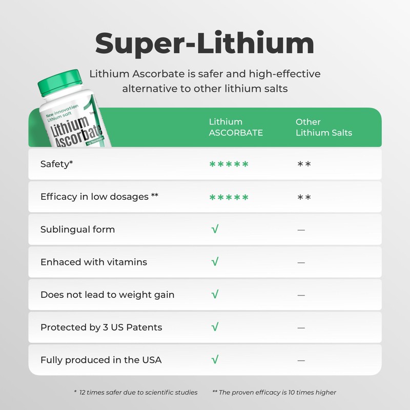 - Gentle, Low-Dose Lithium Ascorbate Each tablet delivers a mild and effective dose of lithium ascorbate, offering a natural way to promote mental resilience and emotional regulation. Designed for daily support with no harsh side effects or dependence concerns, making it easy to incorporate.