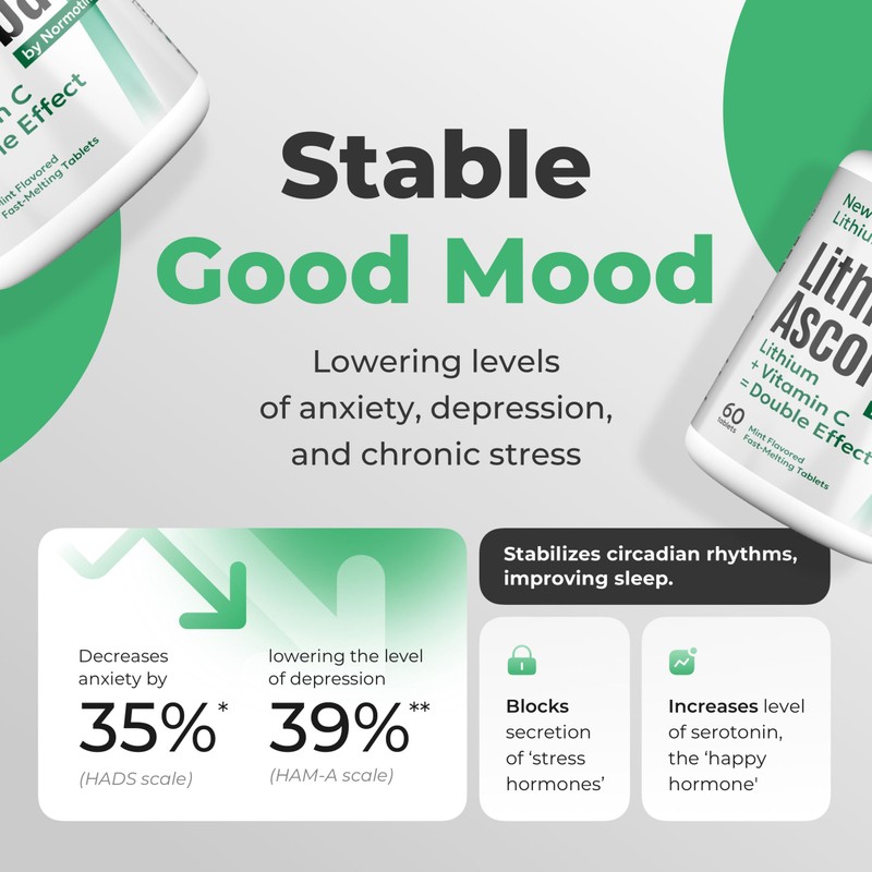 - Complete Brain and Mood Support Normotim Lithium Ascorbate 1 mg provides essential trace minerals combined with vitamin C to support cognitive clarity, memory, mental sharpness, emotional balance, and daily mood stability without overstimulation. 180 tablets total for long-term use.