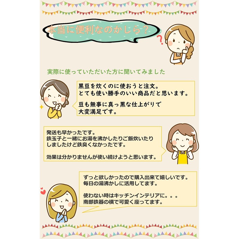 Iron content comes from food and Nambu ironware. When cooked with Nambu ironware, the iron melts and the amount of iron is more than stainless steel. In addition, it was a form of iron (divalent inorganic iron) that is easy to absorb by nearly 80% of the iron emitted from the tetsukettle. The use of Nambu Ironware cookware allows you to replenish the iron that is often lack in modern diets. We want to supplement iron by utilizing iron cookware on a daily basis. [Precautions before use] Please wash thoroughly before using. There is a rust smell for the first time, but it will gradually disappear, so please use it with confidence. Box dimensions: 2.8 x 1.6 x 1.5 inches (72 x 41