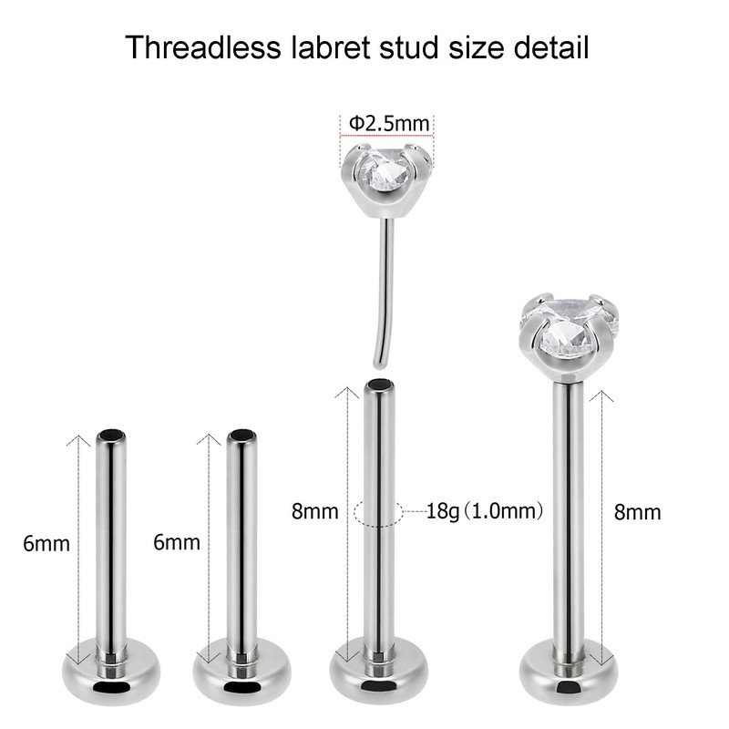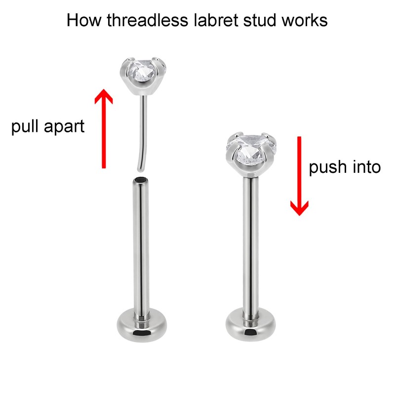 - 【FEATURES】: No thread on top,push into/pull apart the pin by hand directly.The top end has an insertion pin which is slightly bent.Threadless labret use this curved tension to holds the two pieces together securely.