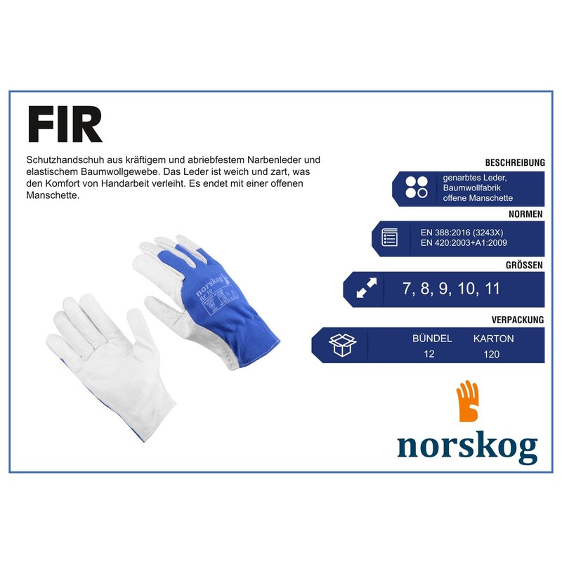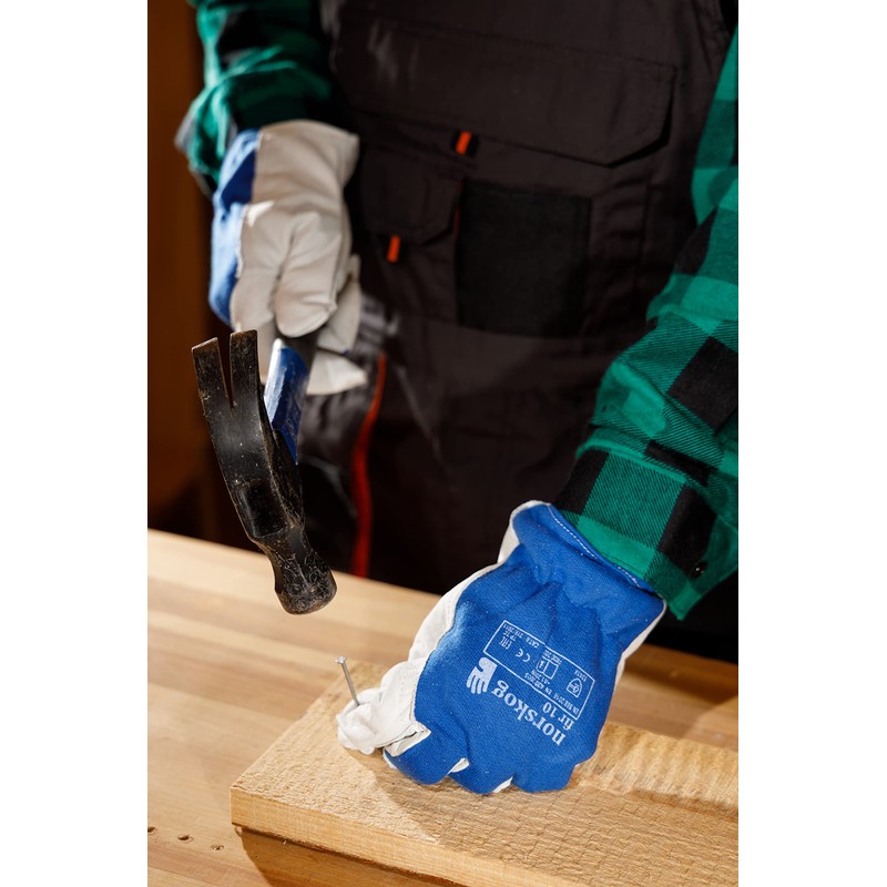 NORSKOG FIR is an assembly glove reinforced with selected full goat leather. Leather tanned so that the inside is comfortable and soft - velvety and smooth on the outside. This design allows the combination of ergonomics and hand protection - even in demanding conditions. Thanks to the size selection of the glove, you can choose the perfect size that fits your hand for both general and assembly work as well as working with very high precision. The design made of selected natural goatskin leather and high-quality cotton allows the hand to breathe freely, which greatly improves the ergonomics of the work. The goatskin stitched thumb provides full hand protection and extends the life of the glove, by protecting the most stressed areas of the glove while working. The cuff with elastic cuffs keeps the glove in proper position on the wrist. The gloves can be used in many industries - they are ideal for assembly, loading, storage, gardening, mechanics and packaging work. The gloves are available in sizes 7 to 11. Quality and protection according to ISO 9001:2008, CE according to PSA CAT II, EN 420, EN 388.