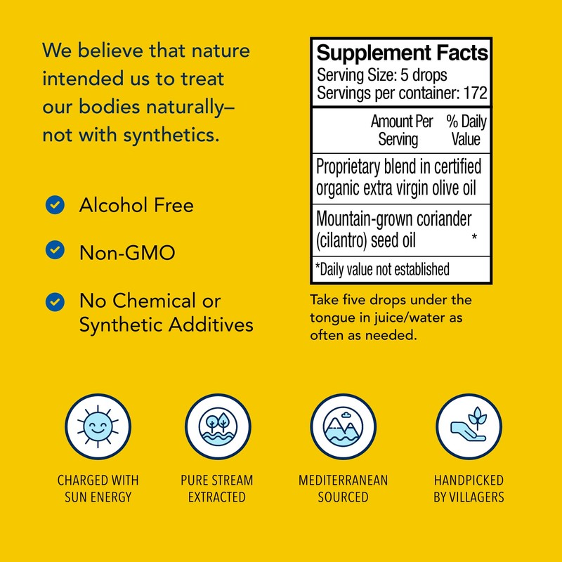 - Full Ingredient List; Mountain-grown cilantro oil, mountain-grown coriander oil, wild oregano oil P73, extra virgin olive oil; Free of all chemicals, pesticides & additives; Take five drops under the tongue or in juice/water as needed