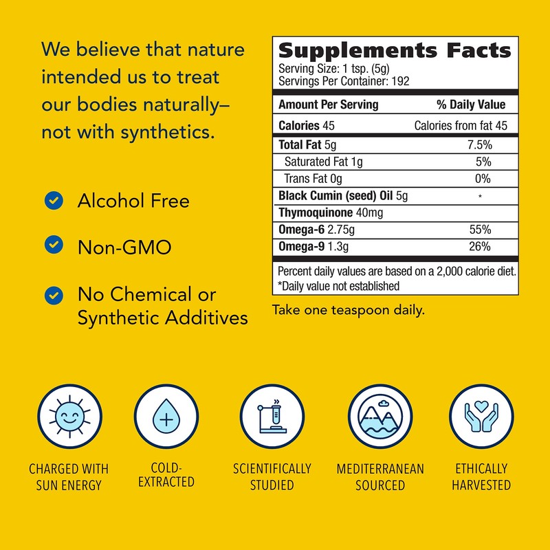 - Full Ingredient List; 100% cold-pressed, extra virgin black seed oil; Free of all chemicals, pesticides & additives; Non-GMO