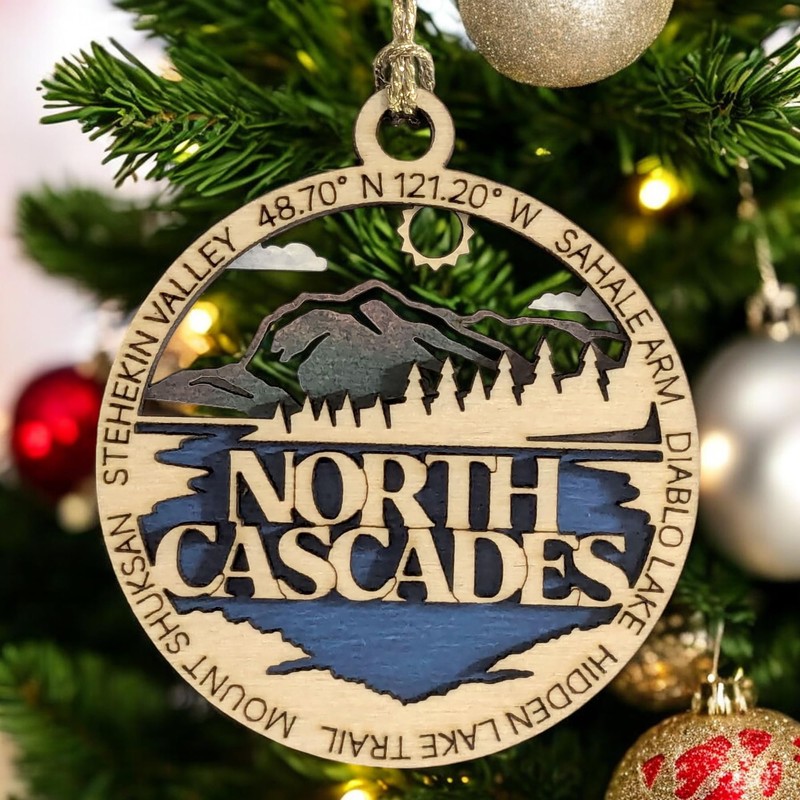 Combining natural wood and full-color elements, this ornament creates striking visual contrast. The back layer boasts a vibrant, full-color depiction of North Cascades scenery, while the top layer showcases warm, natural wood tones, laser-cut to perfection.