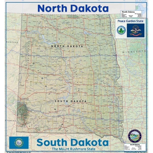A detailed & informative physical map of the US states North & South Dakota. The key map details include information on capital cities, area size, population and largest city along with locations for airport, major highways, state boundaries and populated areas.