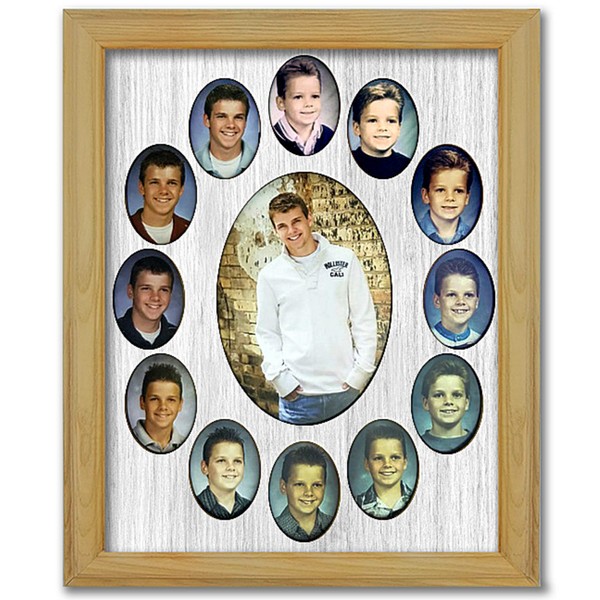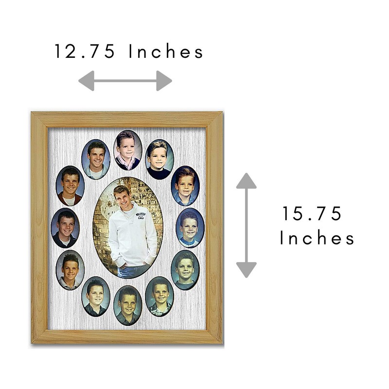 - 13 PICTURE OPENINGS - For Kindergarten through Graduation photos in our Custom Wood Mat Insert. This oval collage frame holds twelve (12) Standard Wallet Size Photos 2 x 3 and one (1) 5x7 Graduation Photo