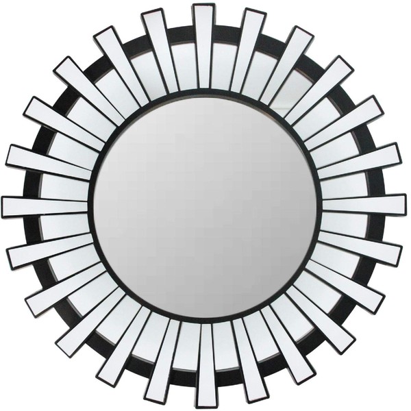 A beautifully crafted mirror is great for opening up the space of any room. This sunburst designed mirror is the perfect addition to your home decor. Easily matched with several decor themes, this mirror includes hanging hardware for effortless installment. Features:. Round black framed mirror. Inner frame creates a large centered circle. Sunburst design created with mirrored rectangles. Includes hanging hardware. Recommended for indoor use only Overall Dimensions: 25.5H x 25.5W x 1D. Center Mirror Dimensions: 14 diameter Material(s): glass/plastic