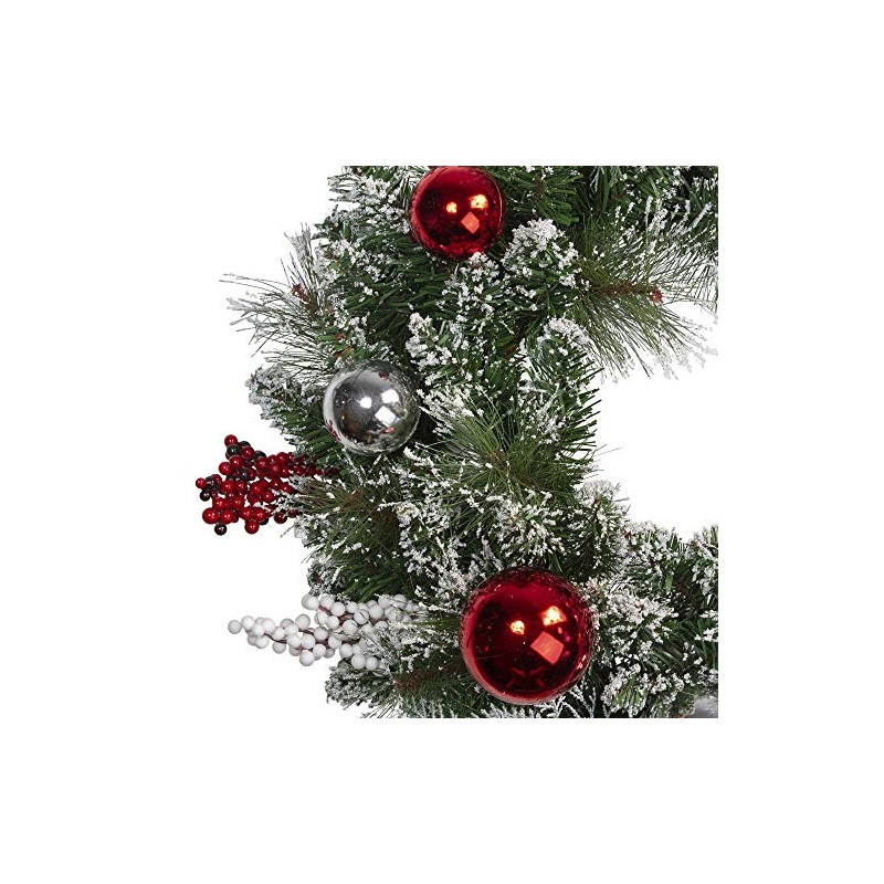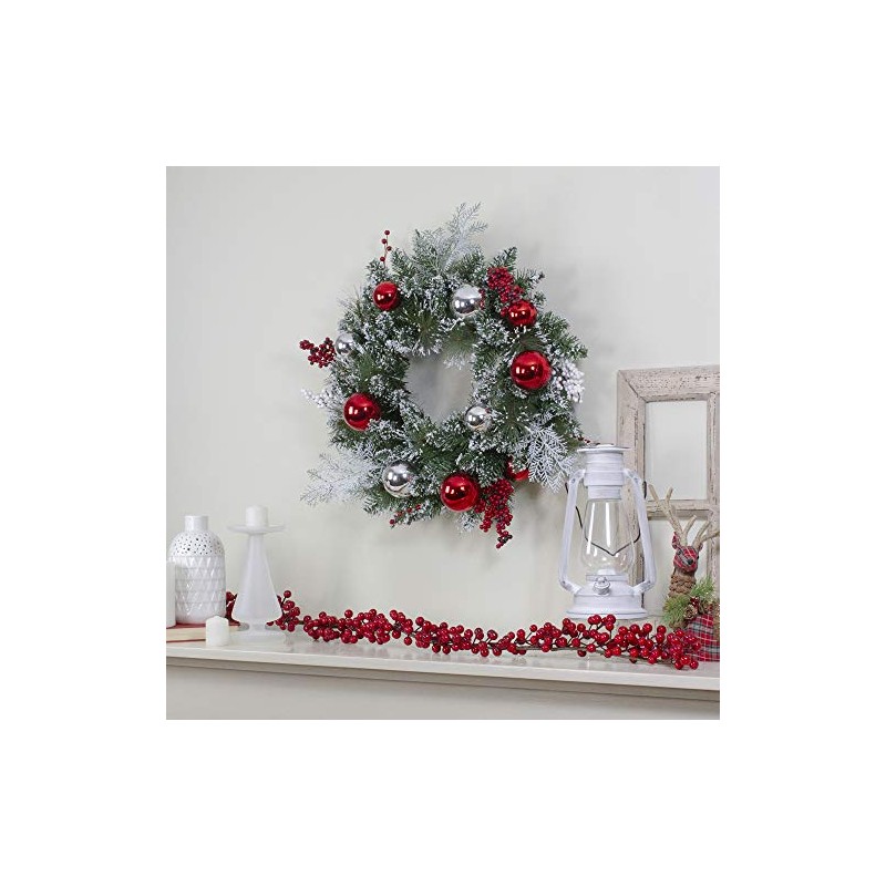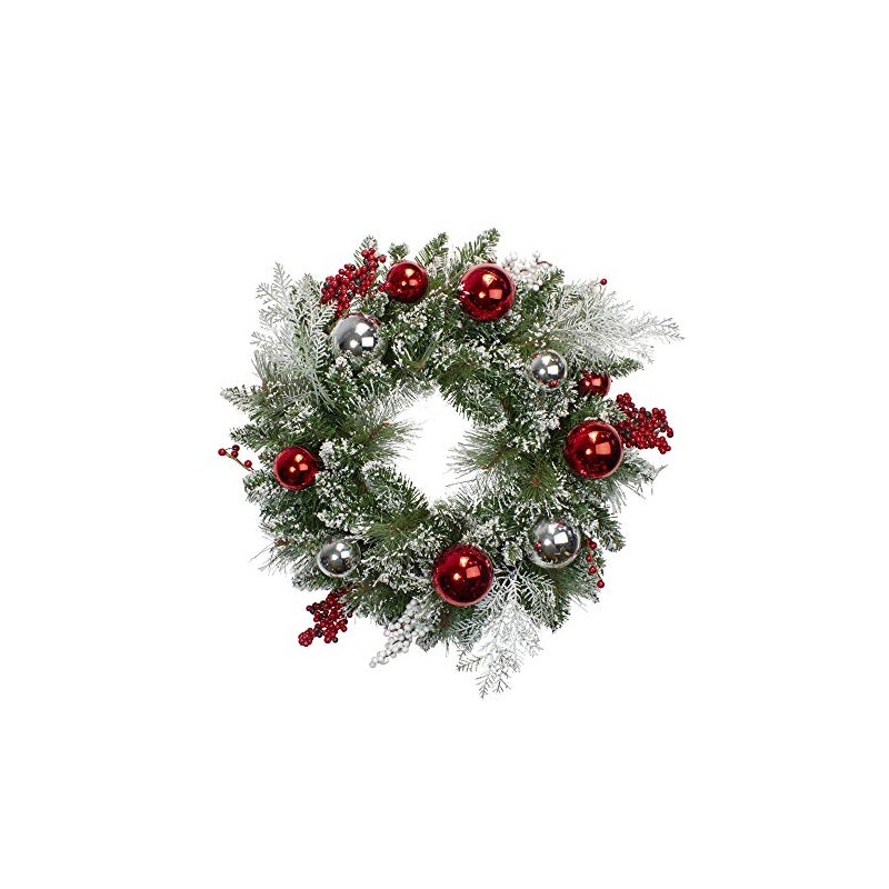 Add this lightly flocked Christmas wreath to your seasonal decor. Red and white berries are accented all around the wreath. This fabulous wreath works perfectly at home or in the office, bringing a bit of holiday cheer wherever you go. Product Features:. Unlit. Mixed pine Christmas wreath. Accented with red and silver ornaments with white and red berries. Entire wreath is lightly flocked with white snow. Recommended for indoor use or outdoor covered use. No assembly required - wreath comes in 1 piece. Includes a heavy-duty ring metal frame backing for hanging Dimensions: 24" diameter (measured from outermost tip/edge to outermost tip/edge across the wreath). Material(s): PVC/plastic/foam/metal Note: Branches are compressed for shipment, and need to be fluffed out upon arrival to look like the photo.