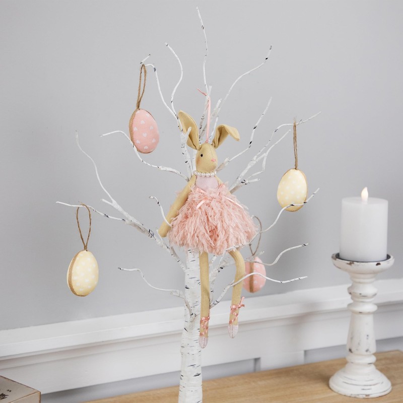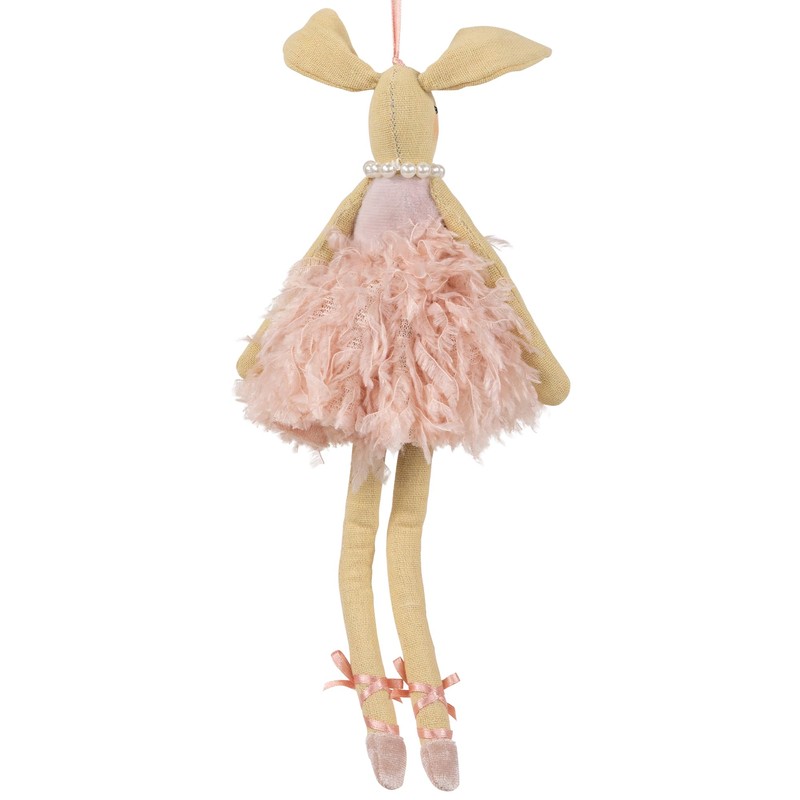 This ballerina bunny is the perfect addition to your Easter decor. This plush bunny is dressed in a pastel pink tutu and matching ballet slippers, all finished off with a glamorous pearl necklace for a sophisticated look. She comes ready to hang with a pink ribbon allowing you to display her gracefully from your mantel, doorways, or any other place you desire. Product Features:. Ballerina bunny hanging decoration. Wearing a pink tutu, ballet slippers and a faux white pearl necklace. Comes ready to hang with a pink ribbon. For indoor use only Dimensions: 13"H x 4.5"W x 2"D. Material(s): fabric/plastic