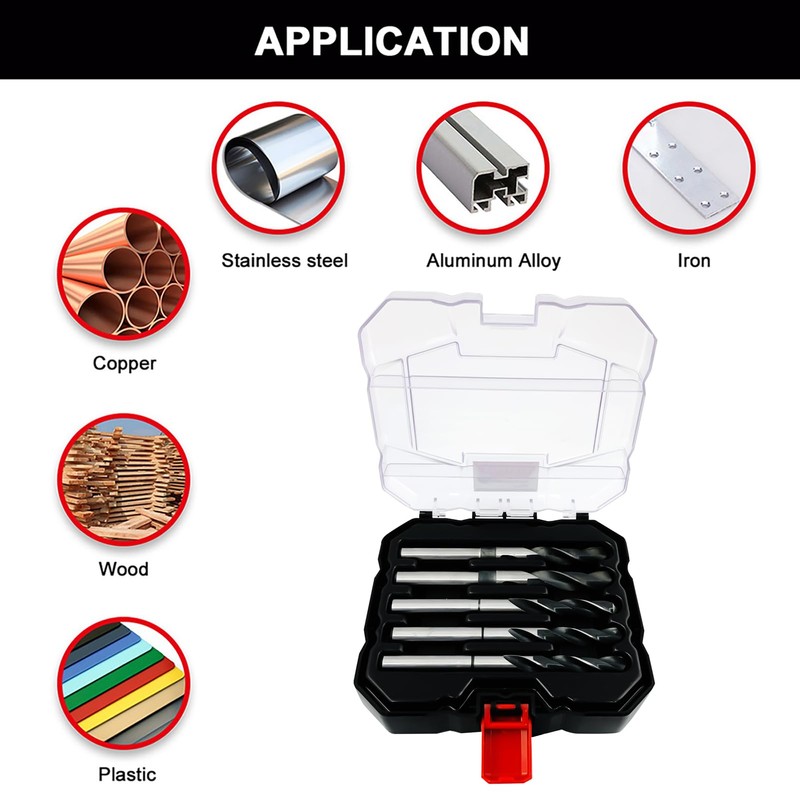• The complete kit includes a wide range of sizes for different applications. 11-12-13-14-15mm Drilling iron, wood, aluminium, steel, especially stainless steel, titanium alloys and other hard to drill materials.