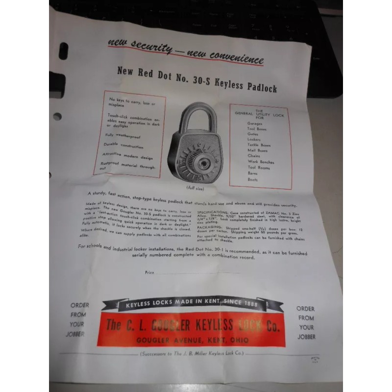 NOS Vintage Antique Gougler Lock Company Keyless Combination Lock 1933
