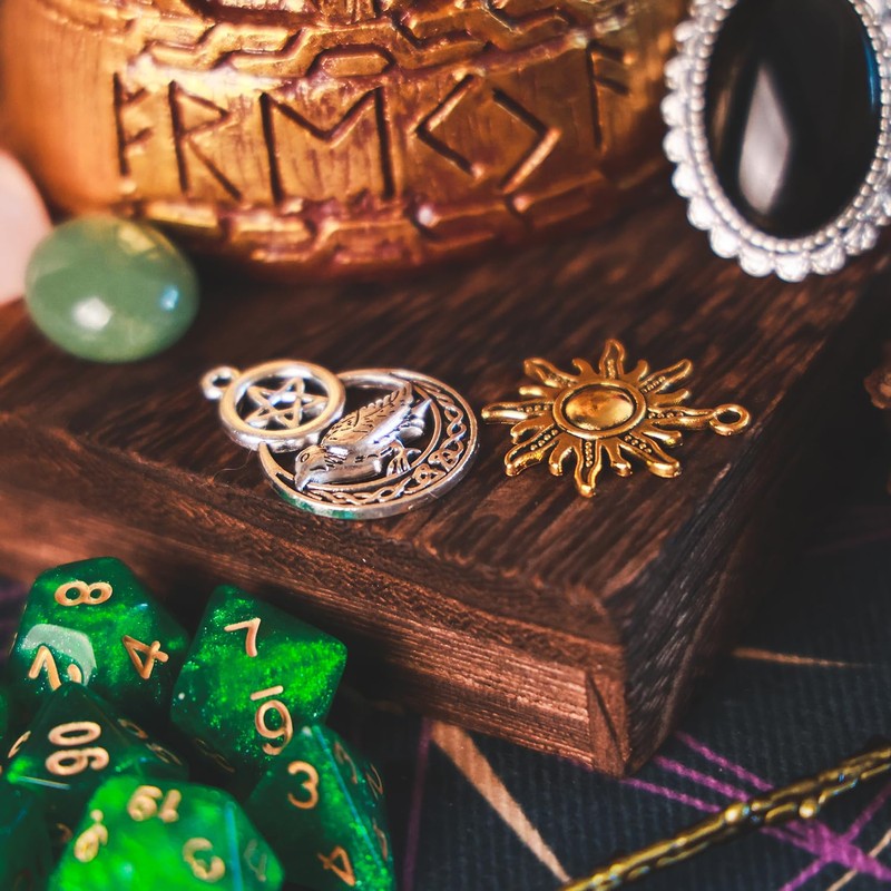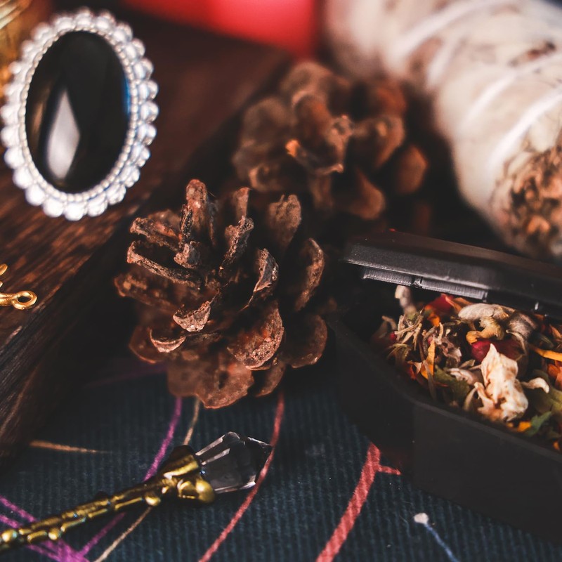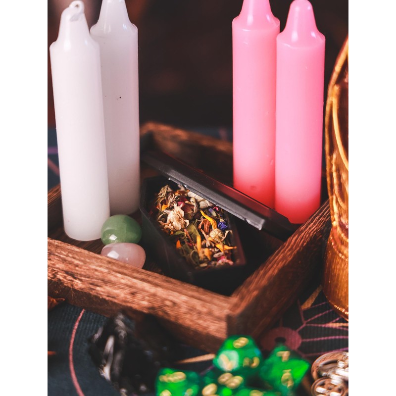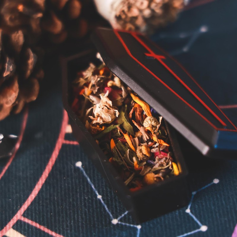 - 【Complete Freya Altar Set】 This set includes a range of symbolic items to honor Freya: a herb blend in a plastic coffin, a small black skull, a sage bundle, a pinecone, red and black candles, a metal snake, a pentagram pendant, dice, a bell, a spoon, an amethyst crystal, and the Freya statue itself.
