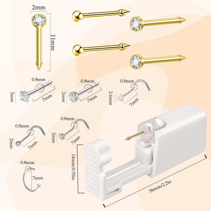 - PIERCING KIT NOSE - Nose piercing kit gold is lightweight and easy to operate. It is convenient for first time users or professionals to use at home or salon. If you can’t do it by yourself, you can ask your family members or friends for help