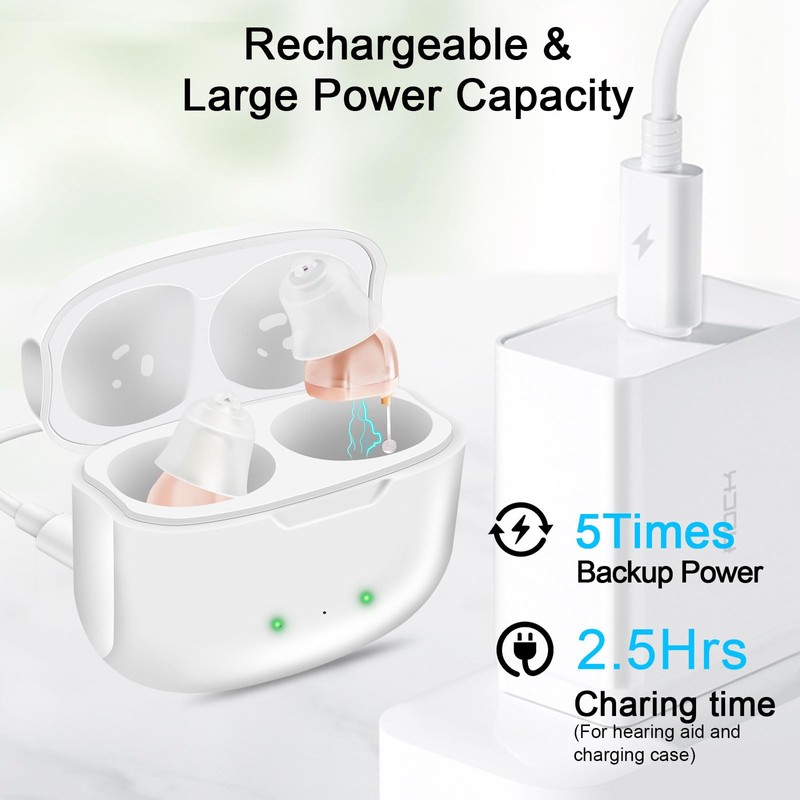 - Extended Battery Life: Experience uninterrupted auditory bliss with a remarkable 18-hour battery life. Recharge during a meal or a short break, and your hearing aids will be ready for extended use, allowing you to focus on what truly matters. You can use the pair for almost a week after for 2.5 hours of fully charged.