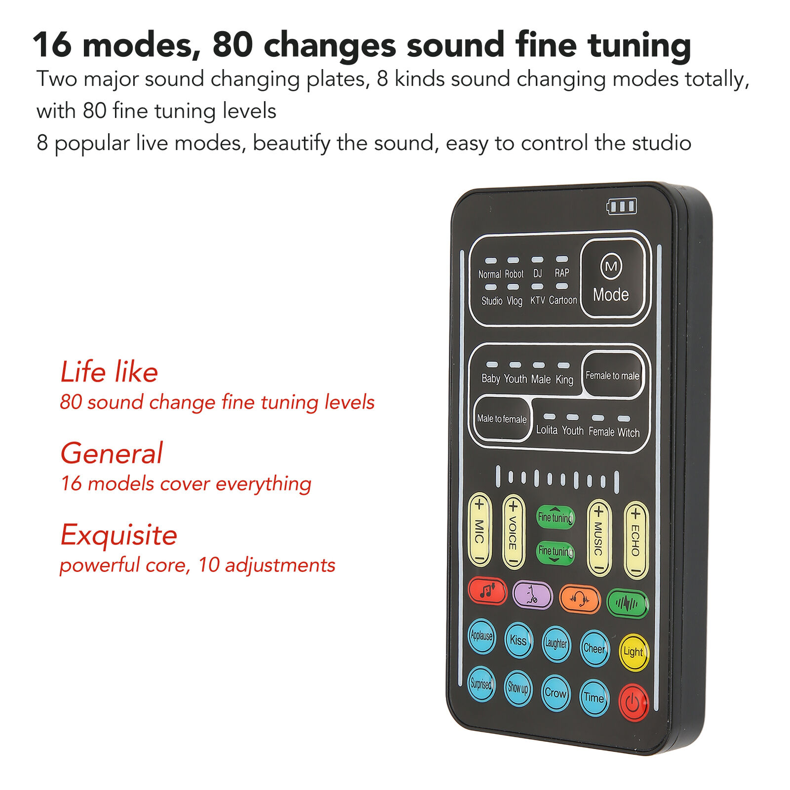 2. 8 Built In Sound Effects: Comes with 8 entertaining sound effects, just press the button for each sound to get interesting sound effects, that is applause, kiss, laughter, delight, surprise, fright, crow and time. The LED lights of the phone sound changer, which has a separate button to control.