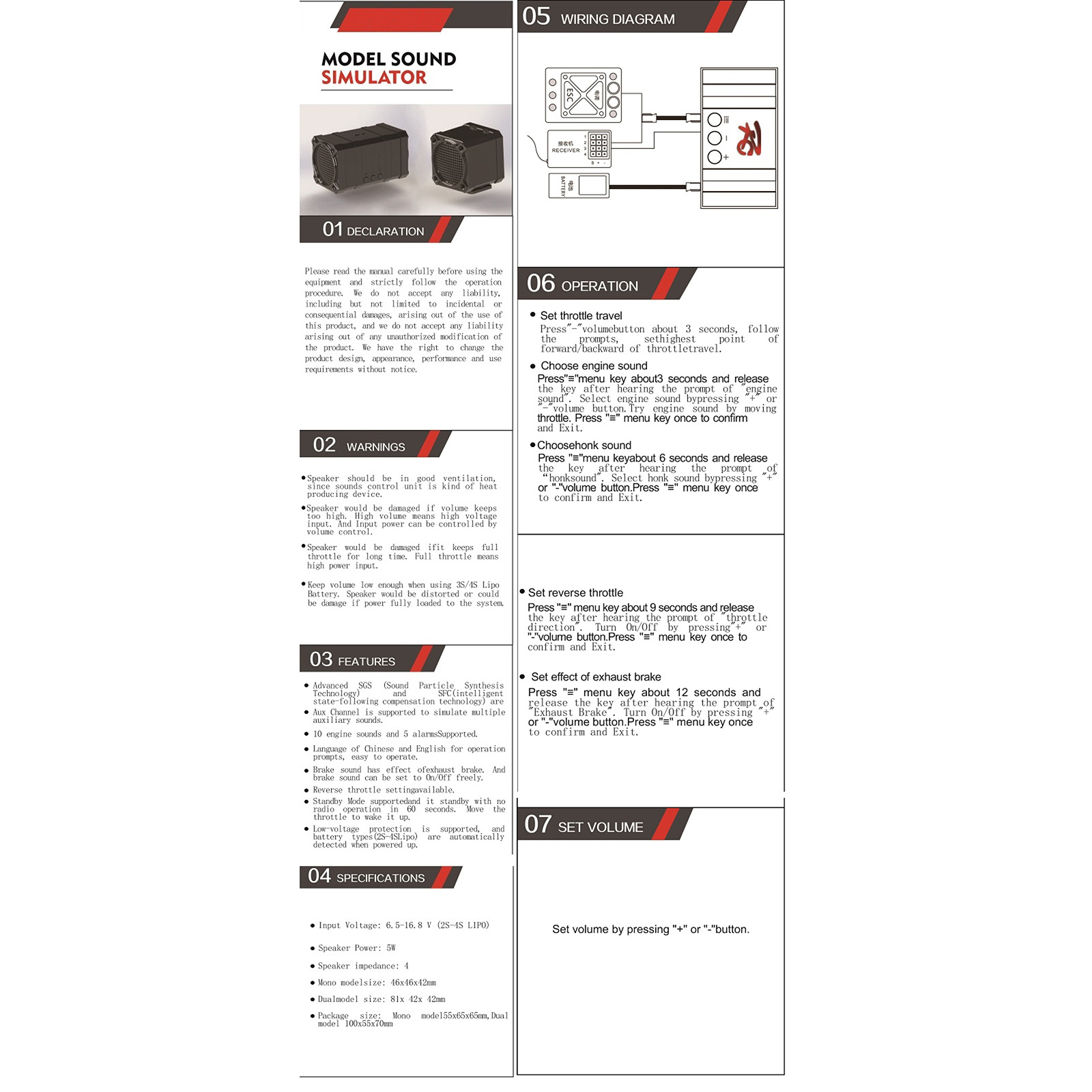 Support AUX channel, can simulate a variety of auxiliary sounds, can simulate various alarm horn sounds, the device supports up to 4S Lipo