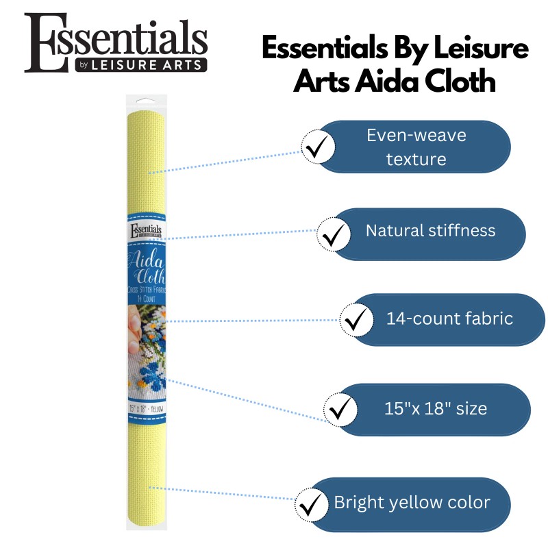Essentials By Leisure Arts Aida Cloth is an open, even-weave fabric traditionally used for counted cross stitch, needlepoint and embroidery. This cotton mesh fabric has a natural stiffness to allow cross stitch and embroidery without a hoop. 14ct Yellow 15"x 18"