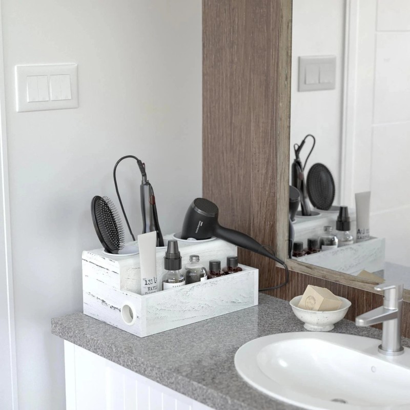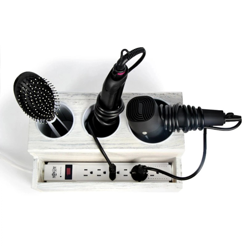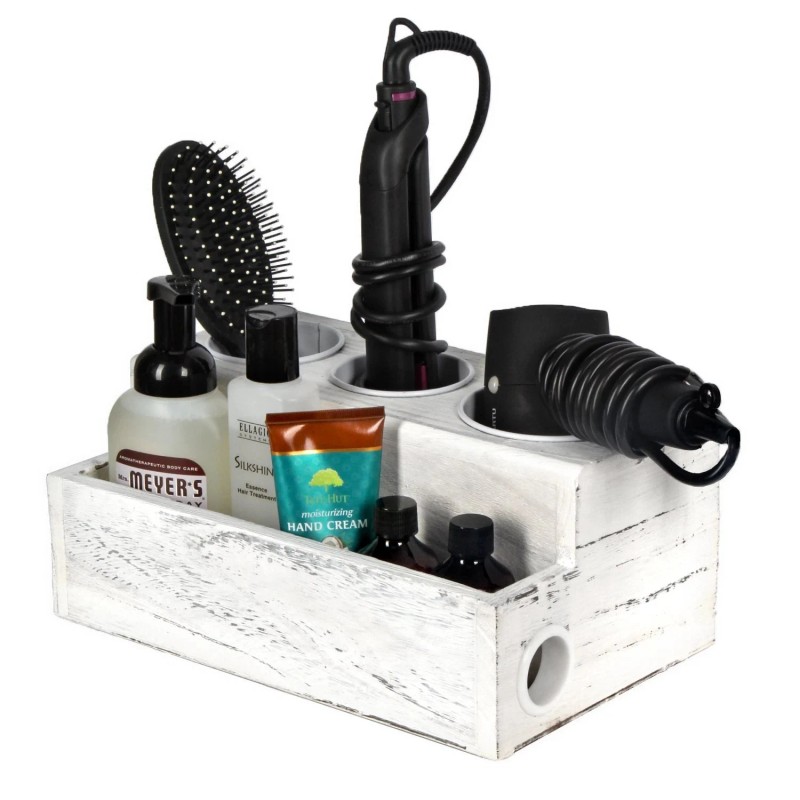 Keep your hair styling tools neat and organized with this carefully designed Hair Dryer Bracket. Made of pristine white washed wood and heat-resistant metal, this bracket achieves the perfect balance between delicacy and durability. It is suitable for both family and professional use, with a large number of compartments to accommodate all your different hair styling products. Equipped with three heat-resistant stainless steel compartments, it safely stores your hot styling tools and provides proof of safety. The additional front storage space allows for easy access to your hair and beauty products, while the fashionable wooden design adds a touch of style to your dressing space. Measuring 12 x 7.4 x 5.25 inches, this bracket also makes for a perfect gift for any special occasion.