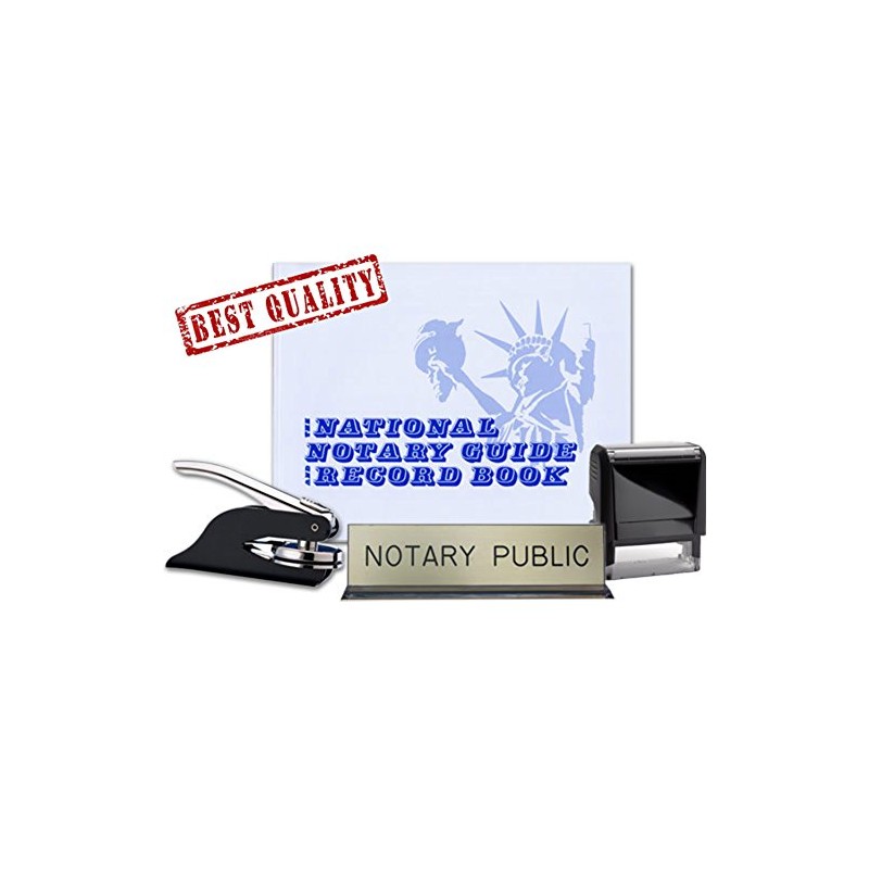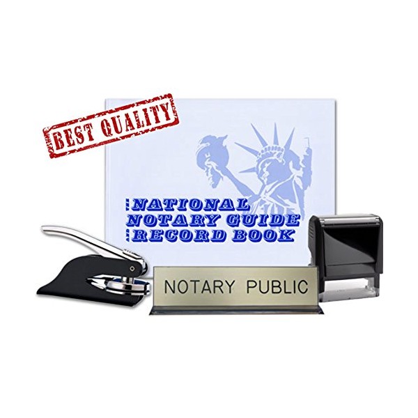 Notary Journal, Self Inking Stamp, Black Pocket Seal Embosser, and Notary Public Desk Sign Bundle | Texas