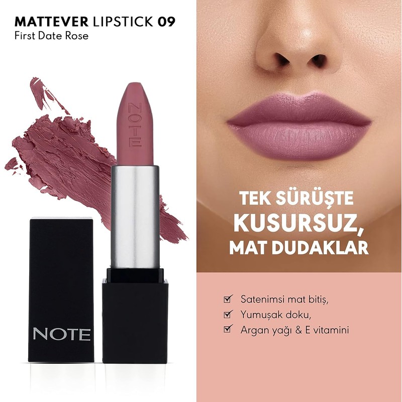 Note Mattever Lipstick 09 First Date Rose Yarı Mat Saten Bitişli Ruj, Pembe Nude