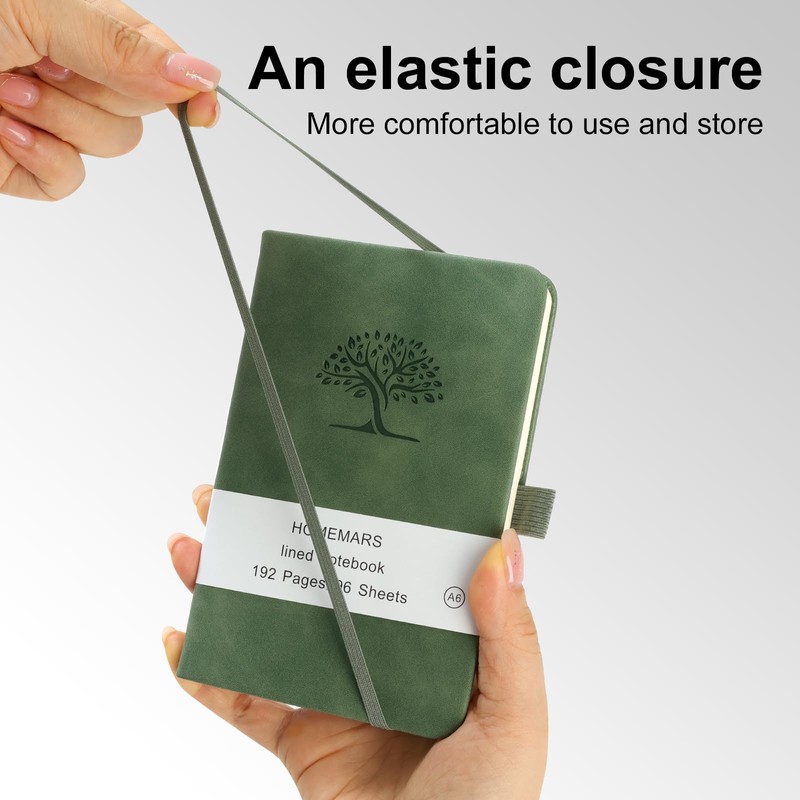 - Reinforced notebook, front and back are sewn by hand. The end result is a beautiful and durable notebook with a unique handmade touch. It features a soft vegan leather cover and elastic closure in traditional pocket size 3.7 inches x 5.7 inches, 14.4 cm x 9.6 cm