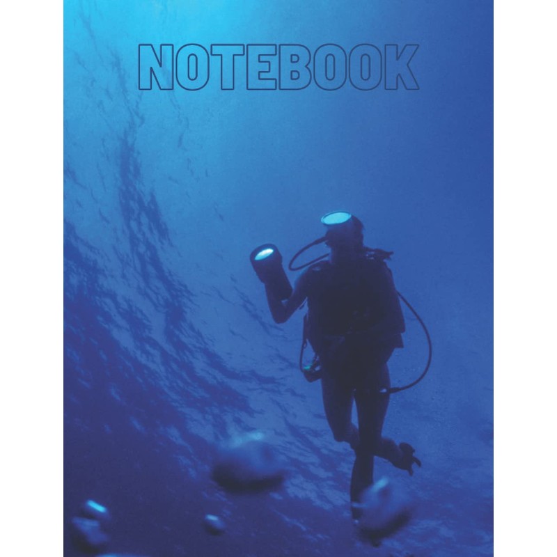 NOTEBOOK: Scuba diver holding underwater flashlight, blue water background. P...