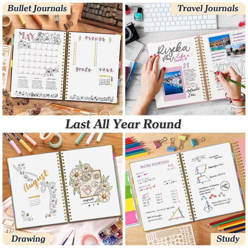 - Thoughtful dot grid journal notebook: the bullet journal notebook contains an elastic closure band for secure closure and an expandable back pocket for storing loose notes or cards. In addition, 24 full color index stickers are included for easy subdivision and note categorization, perfect for school, office, home, work organization, college, shops and adults. In addition, 2 journal stencils are included to DIY your journal.